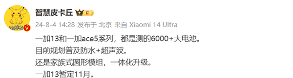 另外,此前有博主透露,一加13将配备超过6000mAh的大容量硅负极高密度电池,并有望采用自研的冰川电池技术,续航能力值得期待。