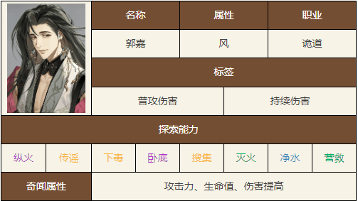 【丹曲】死亡时提升全队属性:郭嘉死亡时,全队获得15%最大生命和攻击力加成,并使受到的伤害降低10%