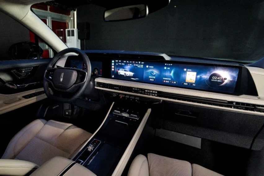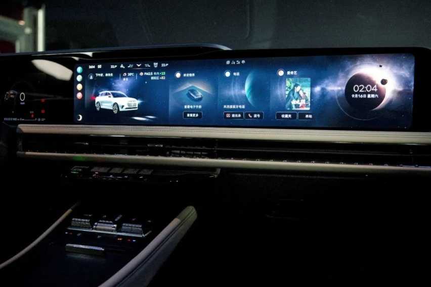 在车内,对角线达到27英寸的全景屏从仪表位置一直贯穿到副驾,不仅酷炫,而且功能丰富,交互合理,其界面布局甚至可以根据副驾驶是否坐人自动调整。即使放在特别能整活儿的新势力车企里,这样的屏幕恐怕也是值得多几页PPT着重宣传的亮点。