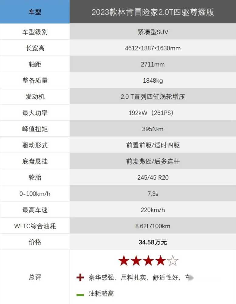 动力方面,2023款冒险家换装了全新的2.0T双喷射发动机,最大功率261马力,峰值扭矩395牛·米——不分高低功率,更没有小排量。全系配以8挡自动变速箱,并提供四驱系统可供选择。从官方数据看,无论发动机功率还是7.3秒的百公里加速,2023款冒险家都是同级别中最好的。不过由于更大的尺寸和更多配置所带来的重量,8.62升/百公里的WLTC油耗成绩也是同级别中比较高的。毕竟顶配四驱版本的整备质量达到1848公斤,几乎达到了Q5、X3等豪华品牌中型SUV的水平。