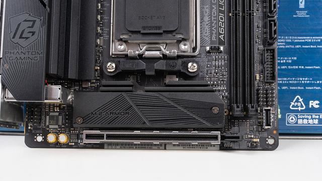 A620I Lightning属于标准ITX版型设计,整体外观是纯黑设计,供电和M.2插槽都覆盖了散热装甲,装甲上仅有简单的纹路和LOGO装饰,设计风格很简洁。基本接口方面,配备2*CPU/水泵风扇+1*机箱风扇以及2*3pin灯光可编程LED接针,还有前置USB 3.2 GEN 1的Type-C,对于ITX玩家确实也没什么短板。