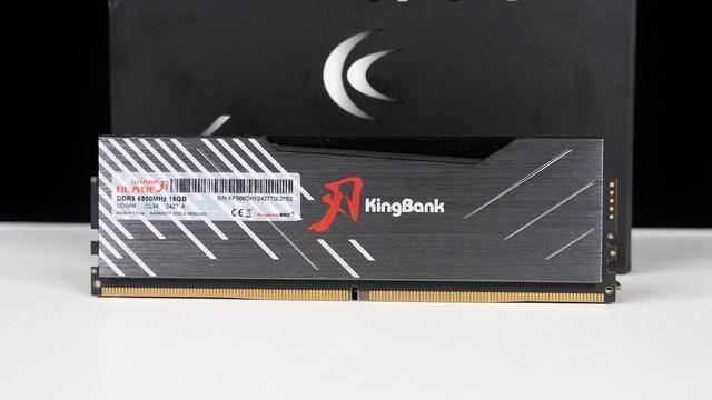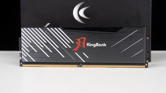 黑刃无灯DDR5外观,整体采用2mm加厚合金散热马甲打造,表面还有阳极氧化和金属拉丝两种工艺结合处理,上手质感相当不错,中间区域还有一个尽显大气的红色刃和KingBank字体,LOGO周围还有白色的线条衬托,上方则是黑色的亚克力层,总得来说非常适合低调纯黑无光装机主题。
