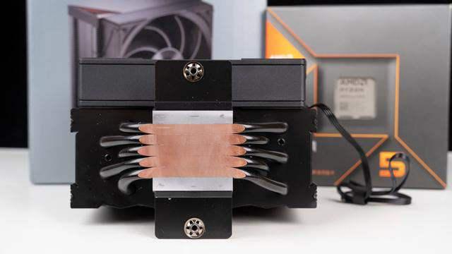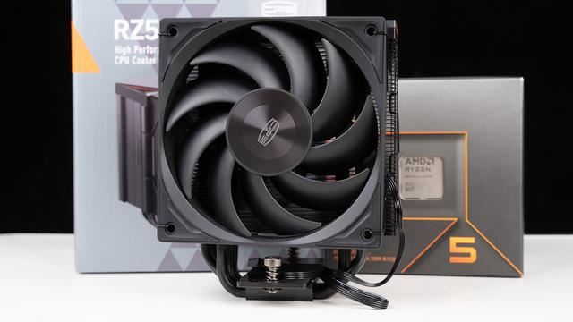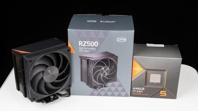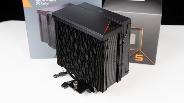 考虑到锐龙5 8600G默认配置功耗只有65W,所以一般是建议配备百元级风冷足以满足,这里准备了来自超频三的黑海RZ500,定位是四热管旗舰风冷,质感设计也是直接拉满,顶部配备了阳极化铝质顶盖,下方还有CPS系列代表的橙色三角几何造型设计,解热功耗官标达到了238W,性能相当强悍,要知道它只有155mm高度。