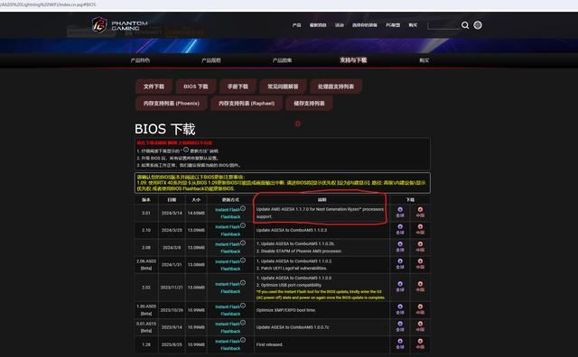上机第一步的良好习惯——先刷最新BIOS,可以看到A620I Lightning目前BIOS已经更新至3.01版本,该版本已经支持AGESA 1.1.7.0软件架构,同时也是支持下一代锐龙9000处理器,而且BIOS还是前两个月就发布了,这不就是选择一、二线板卡厂商的重要原因之一嘛。