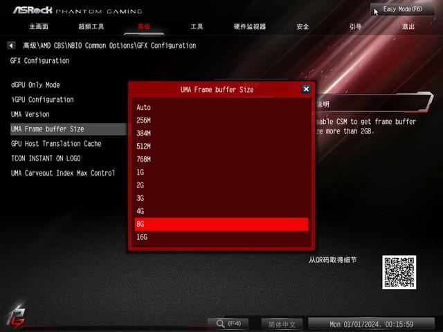 进入BIOS中,对于锐龙5 8600G来说,第一件事情千万别忘了设置显存容量大小,最大可达到16GB,一般分配8GB即可满足大部分玩家需求,华擎BIOS把这个选项(UMA Frame Buffer Size)隐藏得挺深,具体路径上图所见。