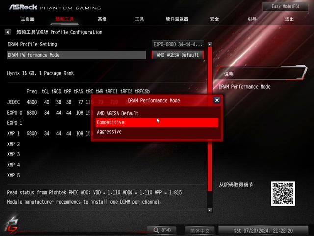 XMP和EXPO是位于超频工具板块中,不过并不在一级页面,而是在二级的DARM Perormance Configuration中,说实话硬核进入BIOS还真找了一阵子,显然这种常用选项还是挪到一级页面最好。值得好评的是,除了XMP和EXPO配置以外,华擎BIOS也有类似于御三家一键优化内存性能的选项——Competitive常规和Aggressive性能两种参数挡位,对于主流玩家建议使用前者即可。