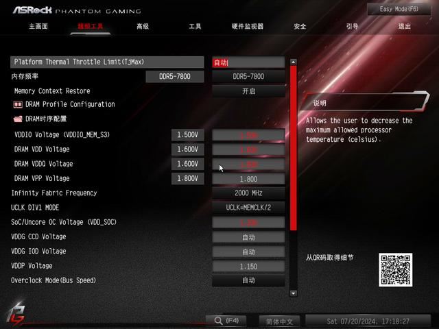 由于A620芯片组并不支持CPU超频,超频工具这板块主要还是针对内存超频,包括小参调整、DRAM VDD、DRAM VDDQ、VDDIO、VDD SOC电压等关键选项都是齐全的,另外也支持Memory Context Restore,可以保证足够快的开机速度。