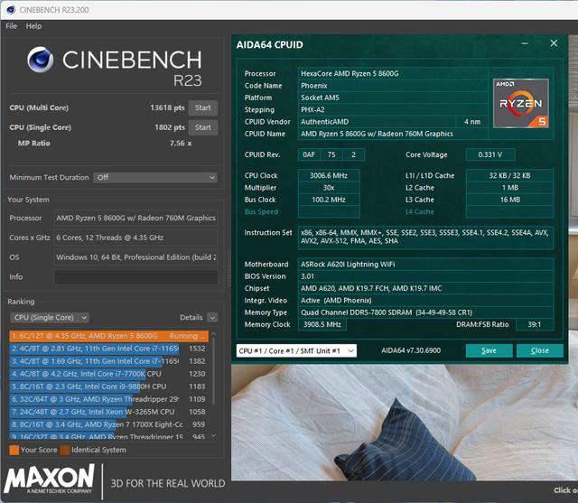 CINEBENCH R23项目,锐龙5 8600G多核跑分为13618 pts,单核跑分为1802 pts,从分数上看性能无疑是最大程度发挥了,对于生产力而言,其实8600G已经很接近锐龙5 7500F了,日常用户最多涉及的生产力——PS和PR内容创作类项目,它也能一定程度上胜任。