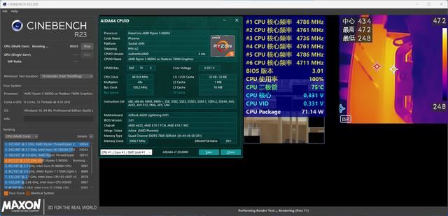 CINEBENCH R23多核十分钟烤机测试,锐龙5 8600G六个核心稳定在4.7GHz~4.8GHz左右,CPU二极管最高温度为75℃,CPU Package功耗为71W,事实证明8600G用RZ500这种四热管旗舰风冷压制就能满足散热需求。