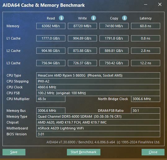 Ryzen 5 8600G+A620I Lightning+某品牌DDR5 6000C30-38-38-76 16GB*2开启EXPO,AIDA64内存和缓存测试