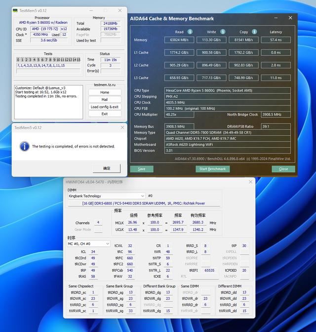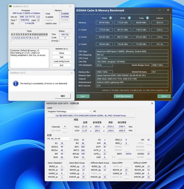 当然对于锐龙5 8600G还是建议尽可能冲击高频,在A620I Lightning上最终可过测十分钟TestMem5 1usmus_V3配置烤机的频率是DDR5 7800C34。
