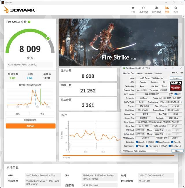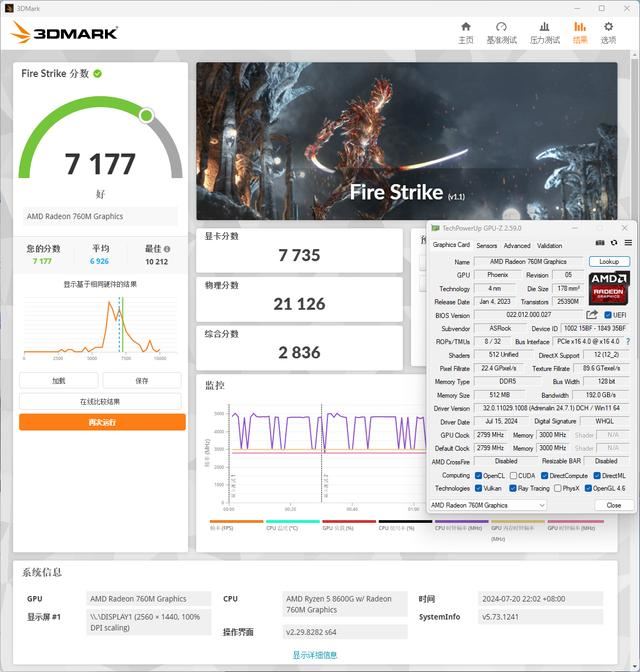 Ryzen 5 8600G+A620I Lightning+某品牌DDR5 6000C30-38-38-76 16GB*2开启EXPO,Radeon 760M在3DMark Fire Strike显卡分数可达到7735