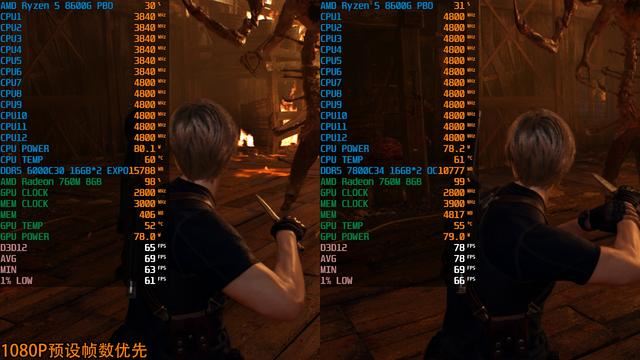 众所周知APU经过内存超频,最大受益方就是核显显卡,7800C34相比6000C30,Radeon 760M的显存频率高了900MHz,这对于带宽性能本就瓶颈的核显来说有巨大增益作用,理论1080P跑分来看,手动超频比6000C30提升足足有11.2%,要知道这还没动核心频率呢,大家可以看看下面三款游戏手动超频前后的对比帧率,最大可达到16%幅度,各位觉得提升大不大呢?