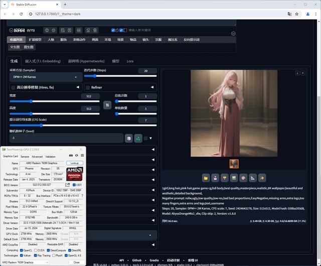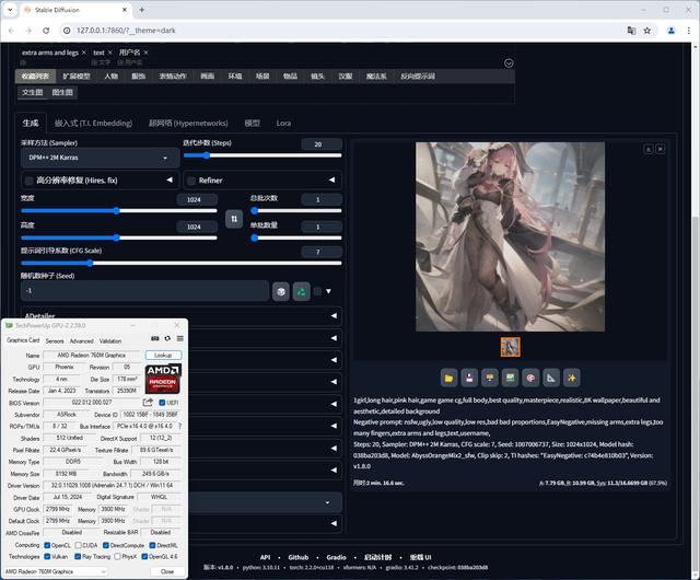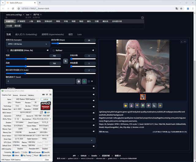 Radeon 760M 8GB Stable diffusion AI绘画时间为49.4秒,SDXL中等显存模式,ZLUDA转译架构,分辨率设置:768X768,总批次:1,单批数量:1