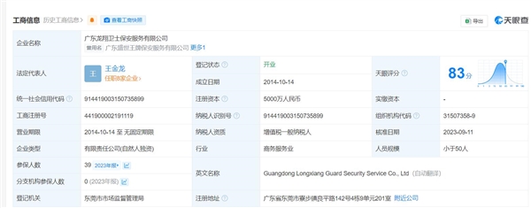 据了解,涉事公司为广东龙翔卫士保安服务有限公司,该公司成立于2014年,注册资本是5000万元。