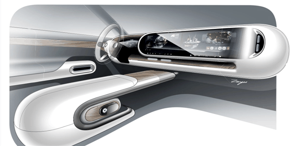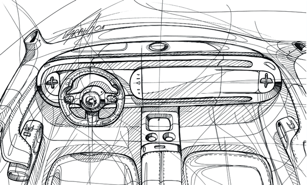 Smart精灵#5的内饰设计草图和渲染图揭示了与smart精灵#1显著不同的设计风格。