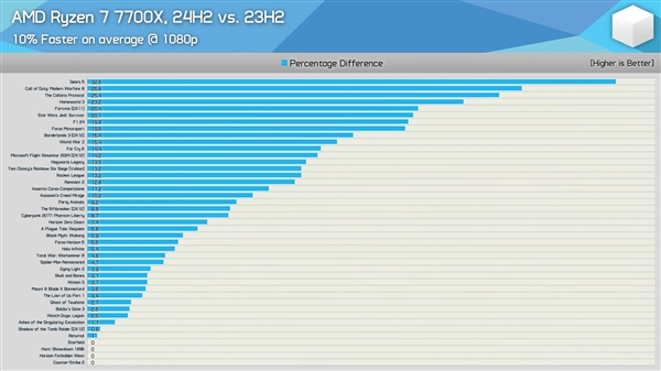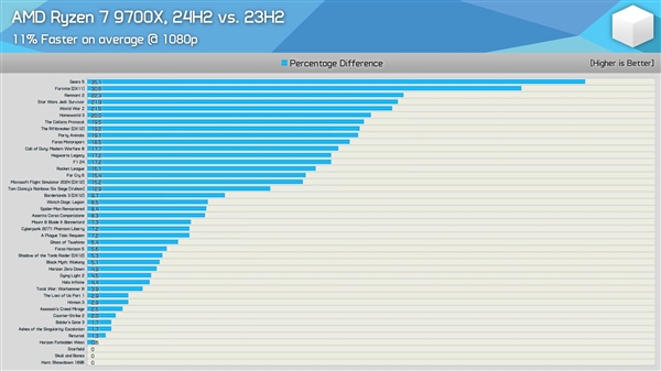 根据外媒实测,Windows 11的这一优化可为锐龙7 9700X带来平均11%的游戏性能提升,部分游戏显得相当夸张,比如《战争机器5》提升35.1%,《堡垒之夜》提升30.6%,《遗迹2》提升22.3%,《星球大战绝地武士:幸存者》提升21.9%,《世界大战3》提升21.5%,《家园3》提升20.0%。