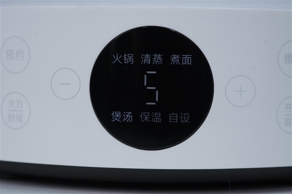 底座上有丰富的操作按键,提供有火锅、清蒸、煮面、煲汤、自设、保温6大预设菜单,支持24小时预约功能。