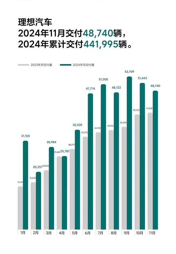 而理想这边其实情况也差不多。它在 11 月交付了 4.8 万辆,累计交付 44 万辆,虽然销量看还是新势力老大哥,但月销在 5 万上下已经持续好几个月了。