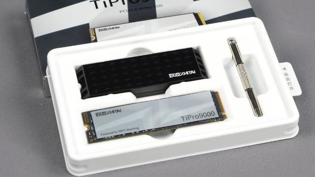 致态TiPro9000使用PCIe 5.0 x4接口,标称读取速度14000 MB/s,相比10GB/s初代PCIe 5.0 SSD快40%,是真正的满血产品。致态TiPro9000附送了尺寸适中的M.2散热器,但没有将其组合在一起,而是由用户自选是否安装。不装散热片能不能用?这个先卖个关子,下文中会有详细测试。