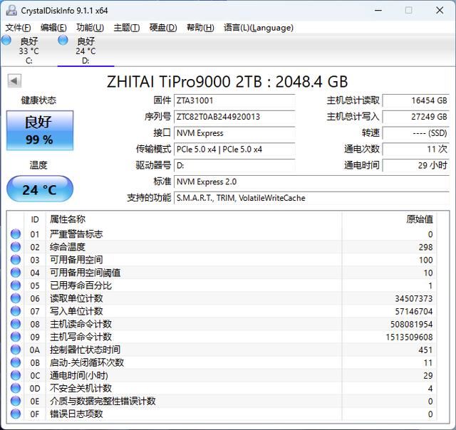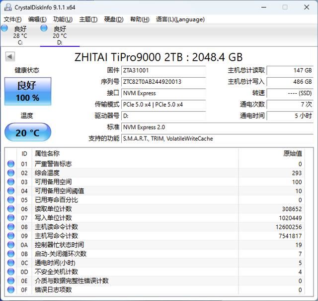 本次测试的致态TiPro9000 2TB搭载了ZTA31001固件,使用PCIe 5.0 x4接口,支持NVMe 2.0协议。