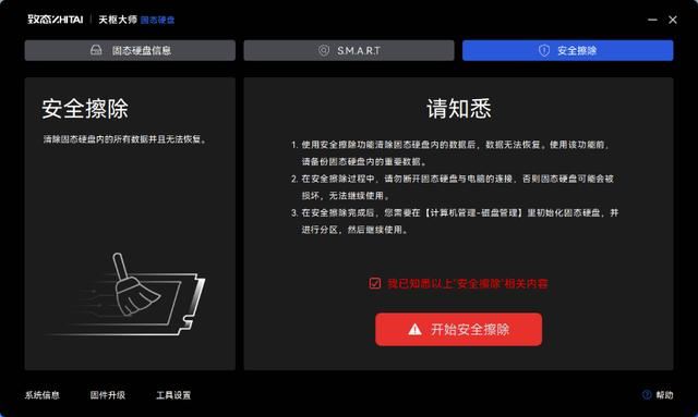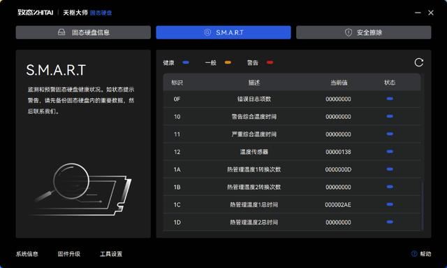 长江存储为致态TiPro9000提供了天枢大师SSD管理软件,功能包括信息识别、SMART健康度查看和数据安全擦除。