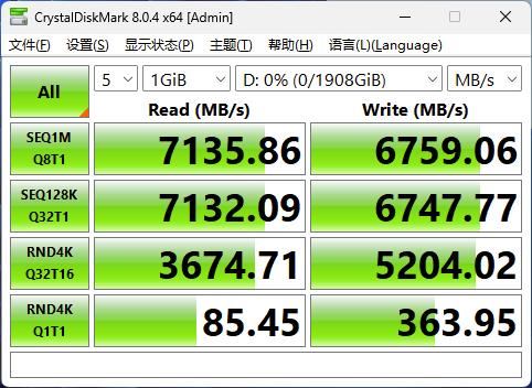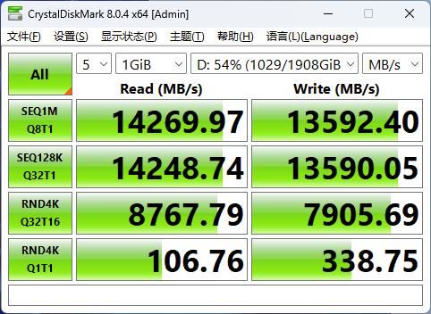 过半盘使用状态下,致态TiPro9000 2TB的实际使用性能依旧保持良好: