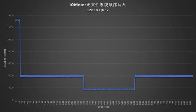 顺序写入测试在无文件系统条件下使用IOMeter进行128KB QD32写入,每秒记录后整理如下图所示。致态TiPro9000 2TB在空盘条件下可提供大约300GB容量的SLC写入缓存,固件并没有一味追求缓存容量大小而使用全盘SLC算法,而是尽可能地均衡了爆发写入与持续重负载使用性能。