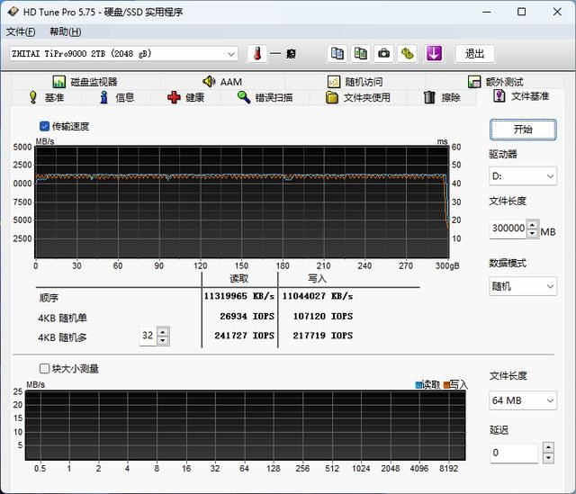 HDTune文件基准测试显示,TiPro9000 2TB此刻仍能提供大约300GB的SLC写入缓存空间: