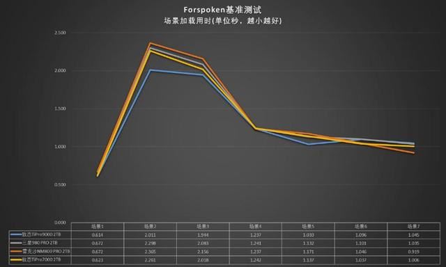 Forspoken基准测试共分为7个测试场景,下面是整理后的成绩对比:致态TiPro9000在加载数据量较大的场景中优势明显。