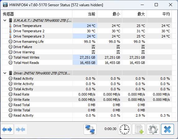 通过HWiNFO64可以看到致态TiPro9000提供了3个不同的温度传感器读数。默认读数同CrystalDiskInfo中的数值相同,过热限速阈值(85度)也是由默认读数确定的。温度2则提供了主控的温度信息,主控发热量更大,但同时相比闪存和DRAM缓存的耐温值也更高。