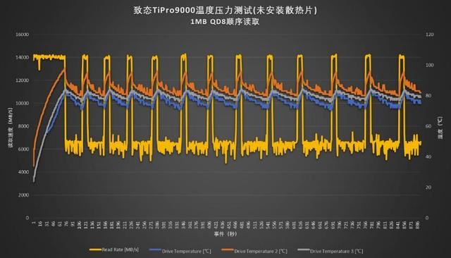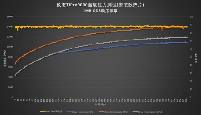 在安装长江存储附送的常规尺寸散热器之后,致态TiPro9000面对连续15分钟满负载读取压力,表现得更加游刃有余。整个测试过程中未触发过热限速,SSD始终发挥着最大顺序读取性能。