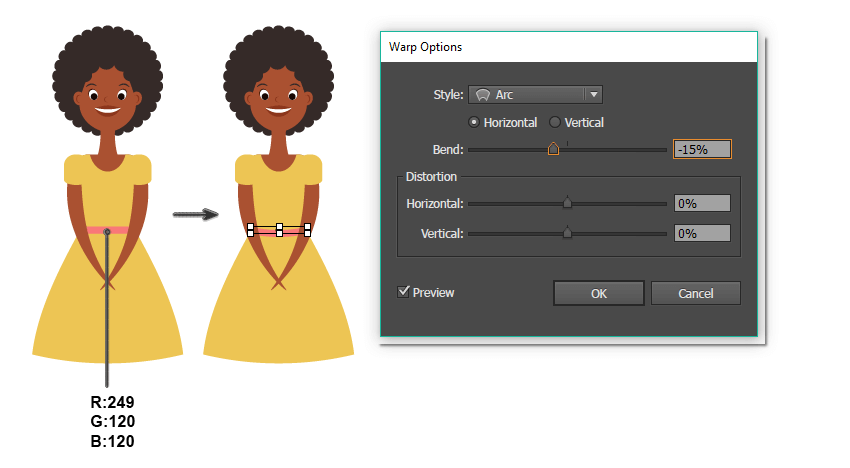 为了制造手臂,我们将从左侧袖子后面的一个薄垂直椭圆开始。要修改这个椭圆,我们将使用下面显示的选项的弧效应(效果>扭曲>弧)。展开创建的形状并稍微向左旋转。