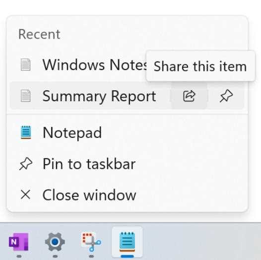 现在用户可以直接通过“跳转列表”功能共享文件。例如用户在任务栏上右键点击记事本等应用,即可选择快速共享文件。