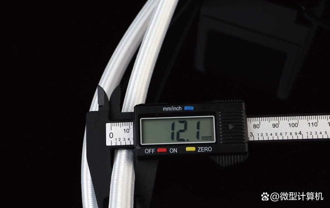 冷头连接冷排的水管内部采用橡胶材质,拥有出色的回弹性和抗疲劳特性,手感比较柔软舒适。外部使用编织网进行包裹,长度为380mm,这在水冷散热器中属于主流长度规格,适用于各类主流的ATX甚至是E-ATX机箱的安装。