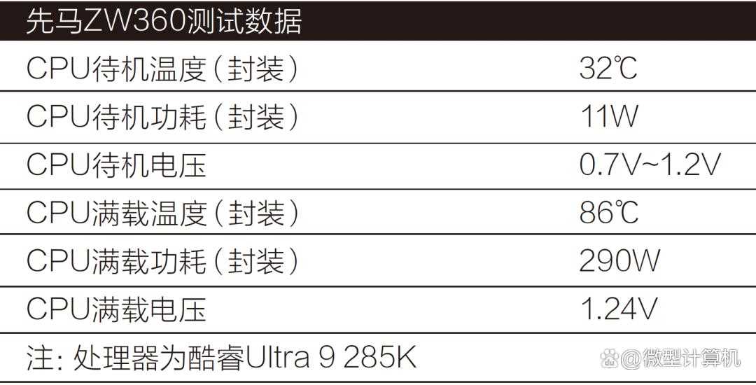 测试结果显示,在满载状态下,酷睿Ultra 9 285K的核心频率可高达5.4GHz(性能核心,能效核心4.6GHz,电压1.24V),而先马ZW360能有效地将处理器的封装温度维持在约86℃,温升温度为66℃。在这种情况下,处理器的封装功耗达到290W,展现出优秀的散热性能。实际上,得益于工艺水平的提升,酷睿Ultra 9 285K相较于前一代的酷睿i9-14900K在功耗控制方面表现更为优异,因此290W的功耗释放证明了处理器性能的充分发挥。换言之,采用先马ZW360与酷睿Ultra 9 285K这类高端处理器的组合,散热问题可以完全忽略。此外,对于使用AMD锐龙系列处理器的用户来说,由于锐龙处理器采用更为先进的工艺,功耗更低,与先马ZW360的搭配使用将更加轻松自如。