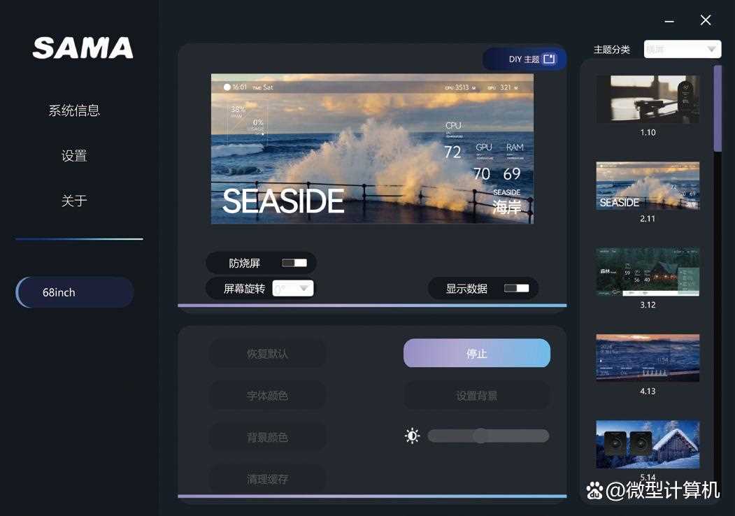 ▲控制软件中内置有超过20款预设主题,也可以自定义主题。同时还可以调整画面角度,并内置防“烧屏”等功能。