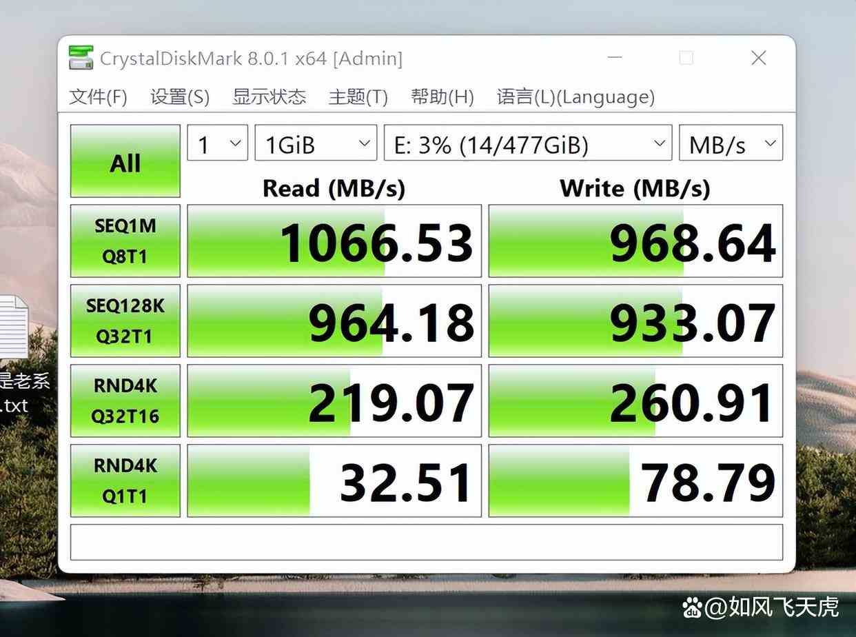 CDM 读写测试,读取1066.53MB/s,写入968.64MB/s,比起普通U盘的几十MB/s,速度快多了。