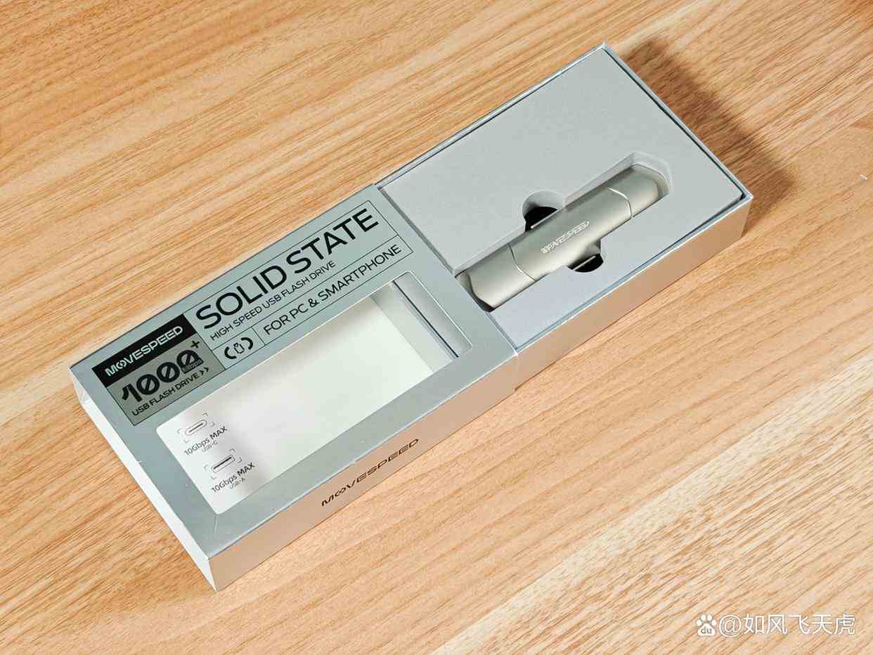 所以我也入手了一款这样的固态U盘,移速的极夜NT10双接口固态U盘,512GB大容量,1000MB/s的速度。银色的包装盒,透明清晰可见里面的固态U盘。抽 拉 式的可轻松拉出里面的内盒。盒子左侧写着10Gbps MAX USB-C和 10Gbps MAX USB-A,代表这款U盘支持USB-A和USB-C两种接口方式,10Gbps也是USB 3.2 Gen 1的协议标准速度。