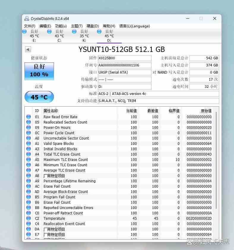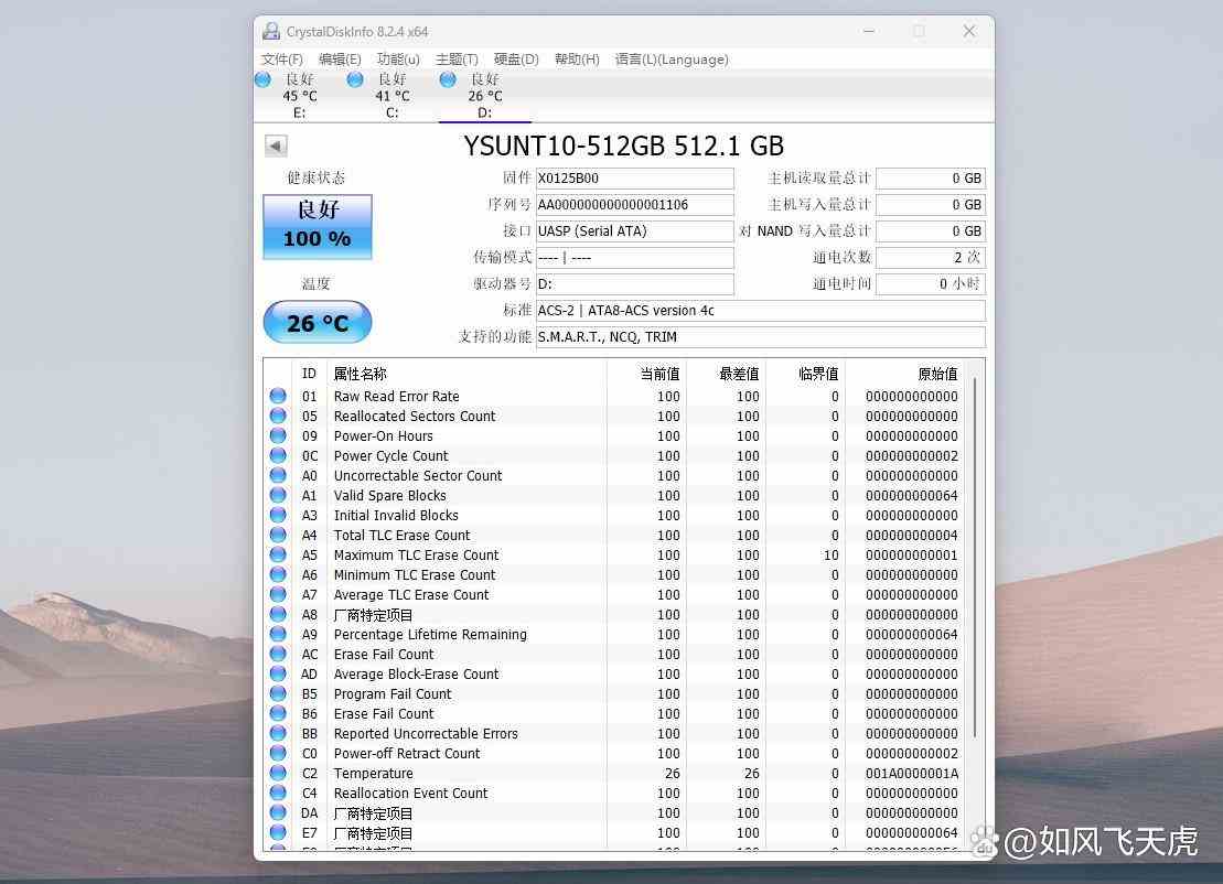 运行CDI,产品的容量是512.1GB,符合标称数值。接口是UASP (Serial ATA),标准是ACS-2|ATA8-ACS version 4c。温度26度,非常清爽。