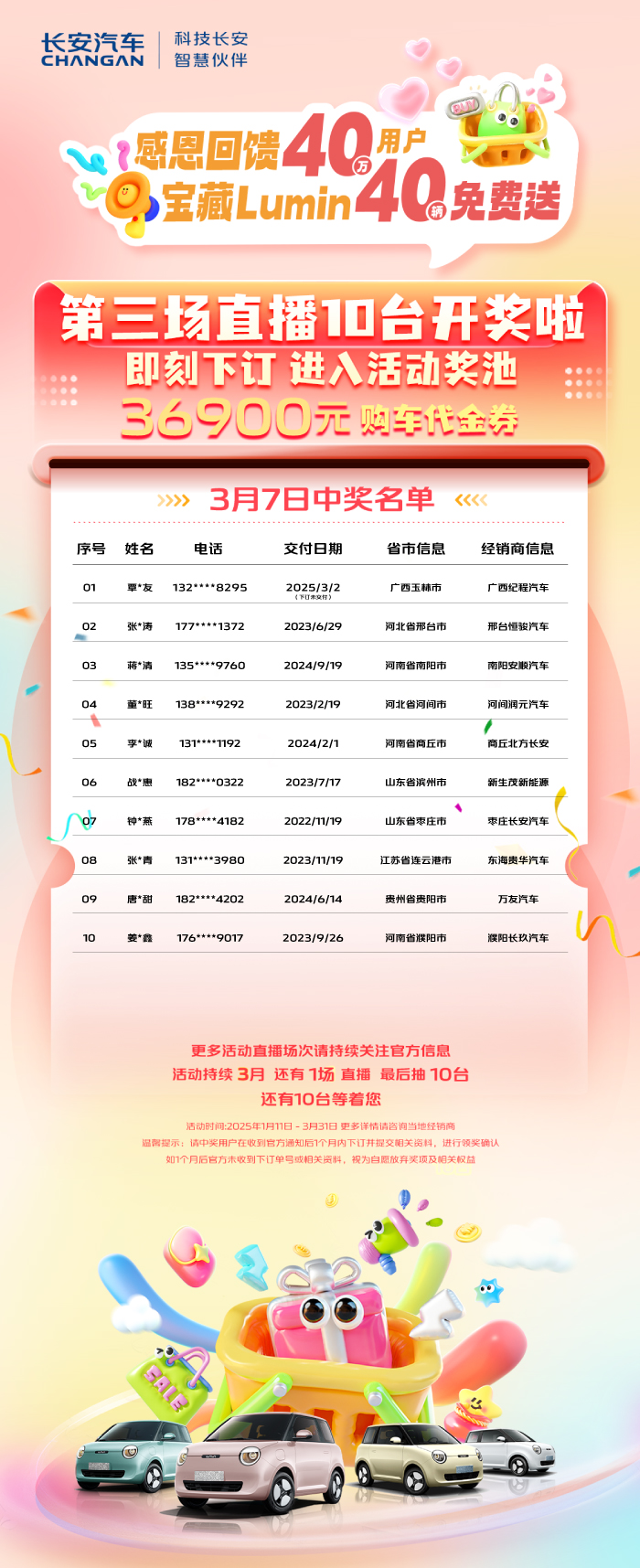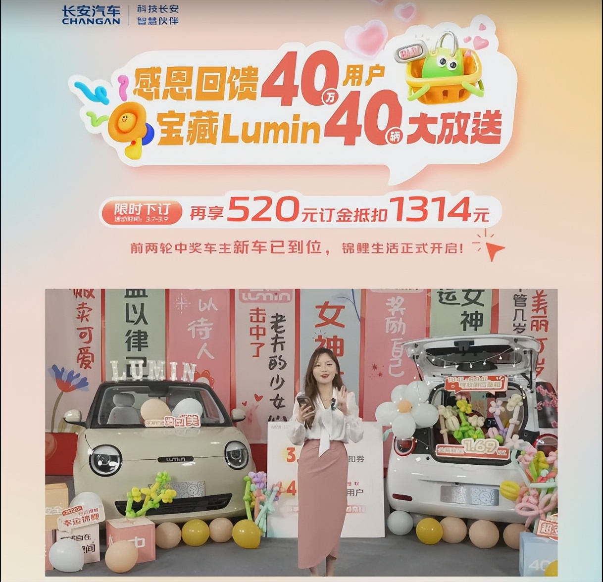 在新能源汽车市场竞争日益激烈的当下,长安Lumin凭借自身独特魅力,收获了超40万用户的信赖。为答谢用户厚爱,3月7日21:00,长安Lumin“感恩回馈40万用户,宝藏Lumin40辆免费送”第三轮抽奖活动,在抖音“车和美”-长安汽车直营官方直播间圆满落下帷幕。