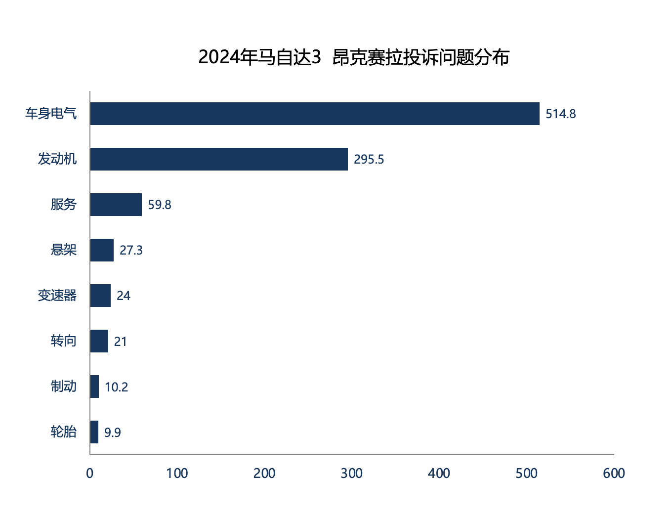 投诉问题来看,车身电气问题以514.8的投诉指数位居投诉榜首,占总投诉指数的53.49%。数据显示,昂克塞拉关于中控屏老化脱胶开裂问题的投诉指数达46.2,占其整体投诉指数的44%。