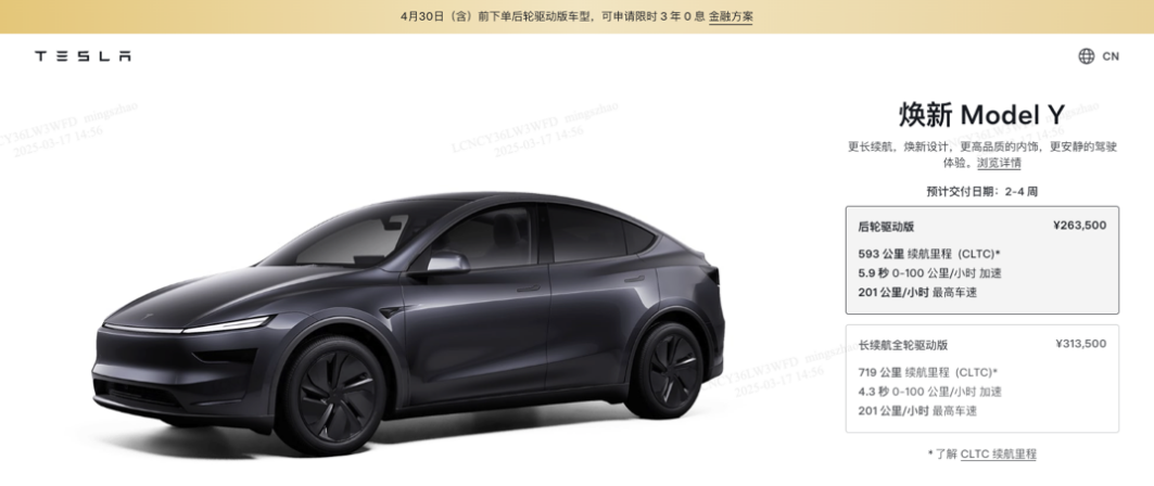 同时,针对焕新Model Y和Model 3限时政策:4月30日前,焕新Model Y后轮驱动版推出3年0息和5年超低息政策,月供低至3808元。3月31日前,Model 3全系8000元现车保险补贴+Model 3后轮驱动版/长续航版5年0息政策,月供低至2460元。