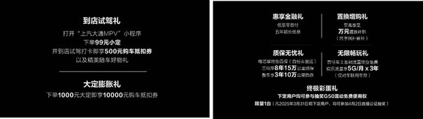 目前,G50混动预售通道仍在持续开放中,预售价15.28万元。此外,其还以一系列诚意满满的优惠政策回馈广大消费者,包括用户支付99元小定,即可锁定权益并获赠精美礼品,到店试驾再送500元膨胀金;限额1000位的大定用户,可享1000元抵1万元的“大定膨胀礼”、最高10000元的“置换增购礼”等五大权益;再结合国家“以旧换新”补贴和购置税减免,购车最多可省4万元+。此外,小定及大定用户还可参与G50混动使用权抽奖,操作流程简单:扫描登录“上汽大通”小程序,完成留资并支付99元即可。
