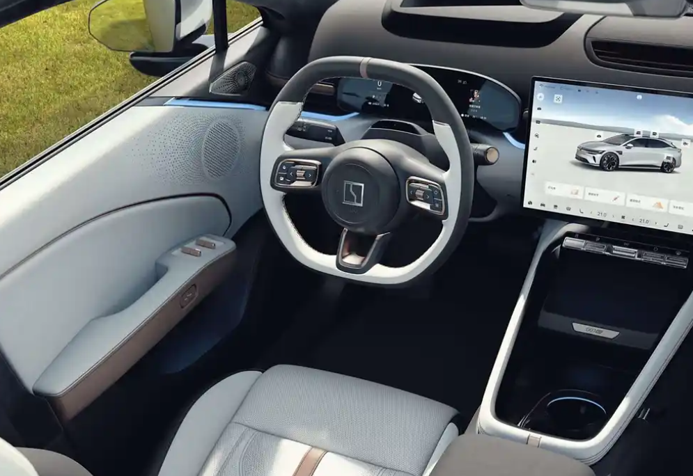 走进极氪007GT车内,可以看到,内饰基本沿用三厢版设计,但在细节上进行了诸多升级。比如说方向盘采用全新家族式三辐设计,平底造型搭配金色回正标,运动氛围十足。悬浮式全液晶仪表和大尺寸中控屏,显示清晰,操作流畅。中控屏下方的一排物理按键,方便了常用功能的操作,也兼顾了科技感与实用性。此外,车辆还配备了新一代EC光感天幕和ZEEKR Sound Pro音响系统,前排头枕、顶篷等处也带有扬声器。