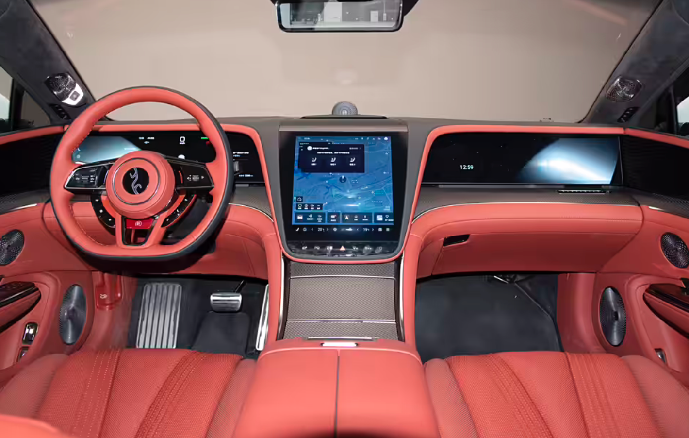 内饰方面,该车和仰望U9一样有着家族式的气息,中控台采用对称式设计,大尺寸竖状中控屏搭配两侧内嵌式液晶仪表+副驾娱乐屏,营造出不错的科技感和时尚感。同时,双拼色的配色方案搭配多处细节加入的镀铬元素,有着不同的视觉冲击,妥妥的高级感凸而出,当然大胆的内饰设计风格,和目前世面上的车有着一定的特点和差异,对于这样内饰喜欢的人在预算合适的情况下,可以入手,此外,该车后排还配备了独立座椅,并在中央扶手处设有娱乐控制屏,对于乘坐在后排的人来说,也能大大提升车辆的使用体验和乘坐感受。