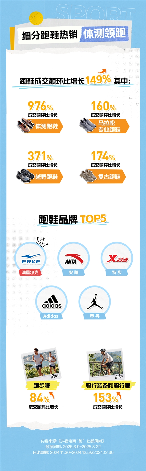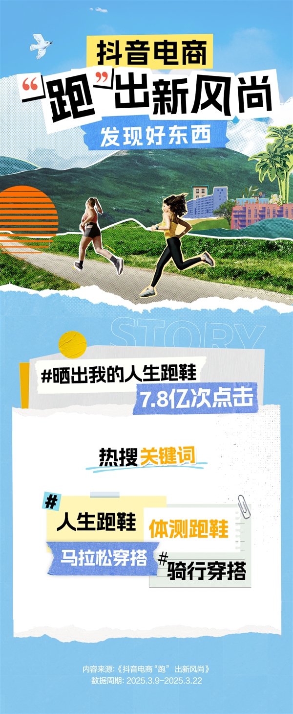 春意渐浓,全民运动热情随气温同步攀升。随着全国马拉松赛事密集开跑、城市骑行活动持续升温,运动消费市场迎来新一轮爆发。抖音电商数据显示,3月以来平台跑步、骑行类商品成交额及话题热度显著上涨,跑鞋成交额环比增长149%,“运动经济”成为春季消费市场的重要增长极。