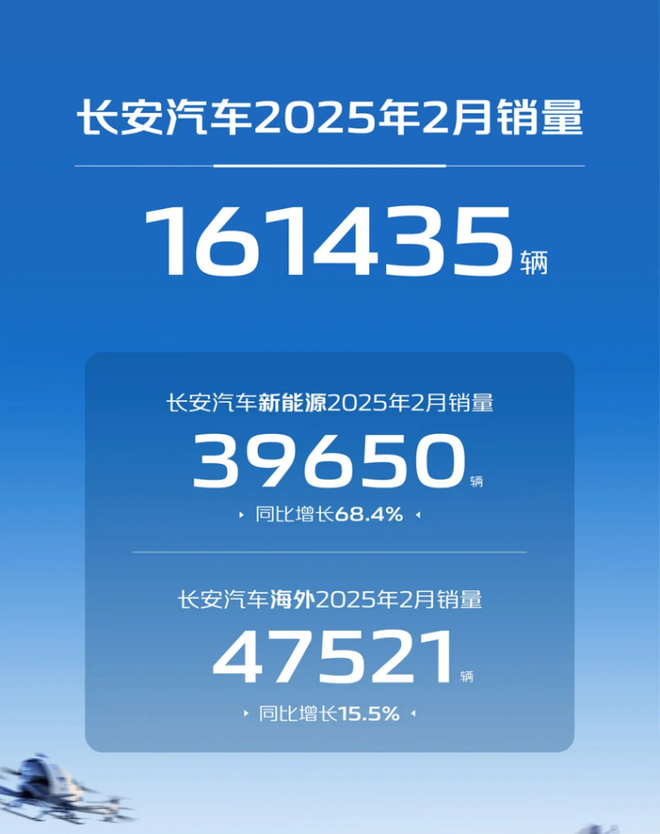 2025年1-2月,长安汽车新能源车销量10.7万辆,其中2月新能源汽车销量3.97万辆,同比增长68.4%。