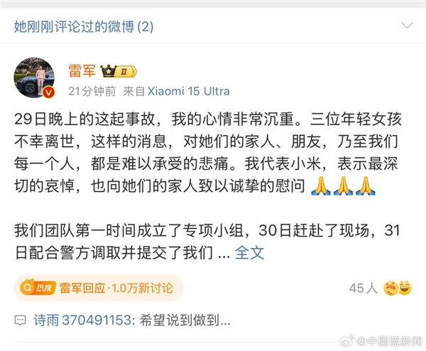 雷军昨晚亲自发文回应称:“29日晚上的这起事故,我的心情非常沉重。三位年轻女孩不幸离世,这样的消息,对她们的家人、朋友,乃至我们每一个人,都是难以承受的悲痛。我代表小米,表示最深切的哀悼,也向她们的家人致以诚挚的慰问。”