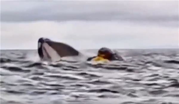 短短几秒后,阿德里安重新浮出水面,随即,一个黑色背鳍在旁边缓缓升起。戴尔这才反应过来:他的儿子刚刚被一头座头鲸吞进了嘴里!戴尔立刻朝着惊魂未定的阿德里安划去,嘴里喊着:“别慌!抓紧你的皮划艇!”